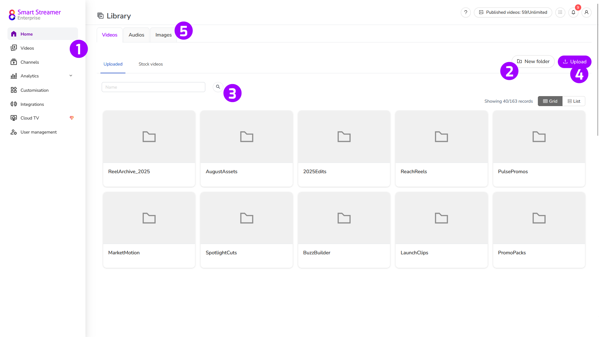Client Projects,Webinars,2024 Assets) to make navigation intuitive. - Drag and drop videos into the appropriate folders to stay organised.